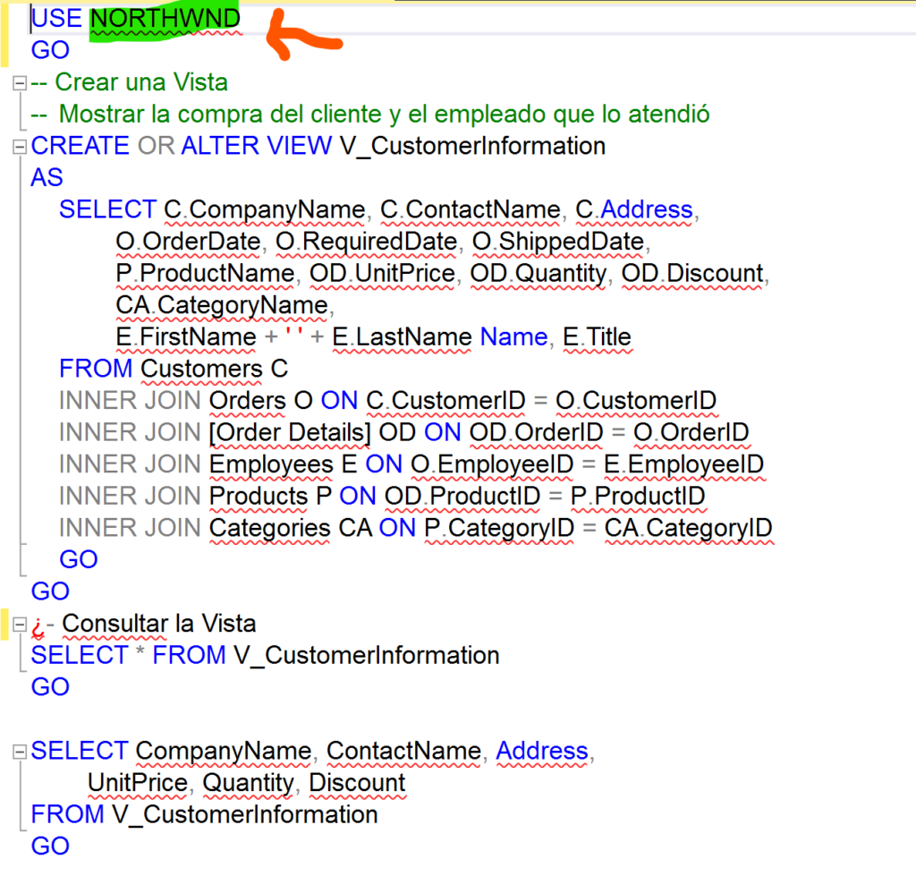 En este ejemplo, el usuario alumno crea una vista en la tabla de empleados para restringir el acceso solo a aquellos registros en los que el departamento es 201: